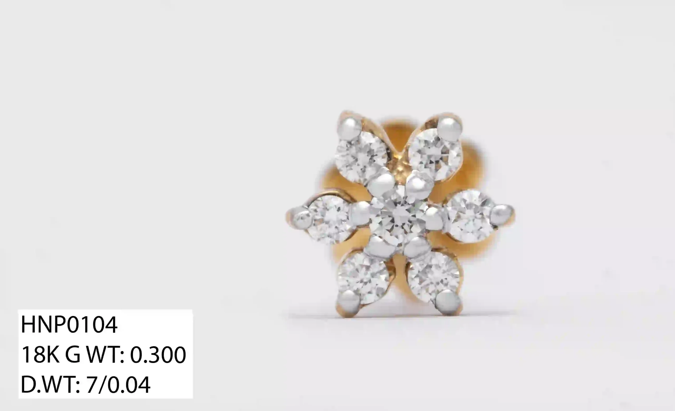 This exquisite 18K gold nose pin (Model: HNP0104) features a beautifully crafted seven-petal floral design, adorned with brilliant diamonds that create a radiant, eye-catching sparkle. With a gold weight of 0.300g, it offers a lightweight yet luxurious feel, perfect for comfortable all-day wear. The seven diamonds, totaling a weight of 7/0.04, are precisely set to enhance shine and elevate the elegance of this timeless piece. Expert craftsmanship ensures durability, brilliance, and a refined finish, making it an ideal accessory for both everyday sophistication and special occasions. A stunning blend of charm and sparkle, this nose pin adds effortless grace to any look.
