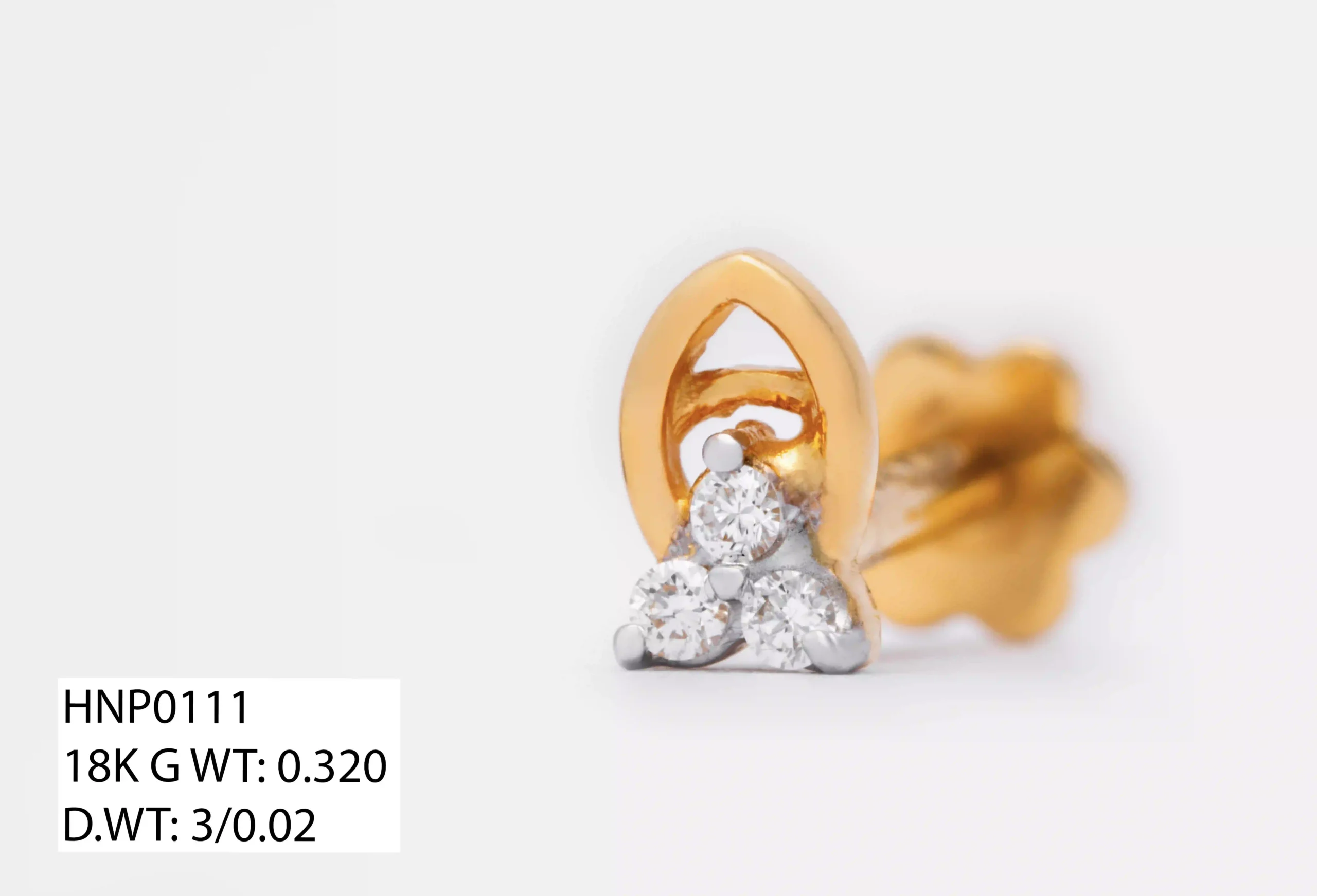 This elegant 18K gold nose pin (Model: HNP0111) features a refined teardrop-inspired frame beautifully complemented by a trio of sparkling diamonds that add a touch of timeless charm. With a gold weight of 0.320g, it offers a lightweight yet luxurious feel, ensuring comfortable wear throughout the day. The three diamonds, totaling 3/0.02 in weight, are precisely set to enhance brilliance and elevate the piece’s delicate design. Expert craftsmanship gives this nose pin a polished, durable finish, making it a stylish choice for both everyday elegance and special occasions. A perfect blend of simplicity and sophistication, it adds a graceful sparkle to any jewelry collection.