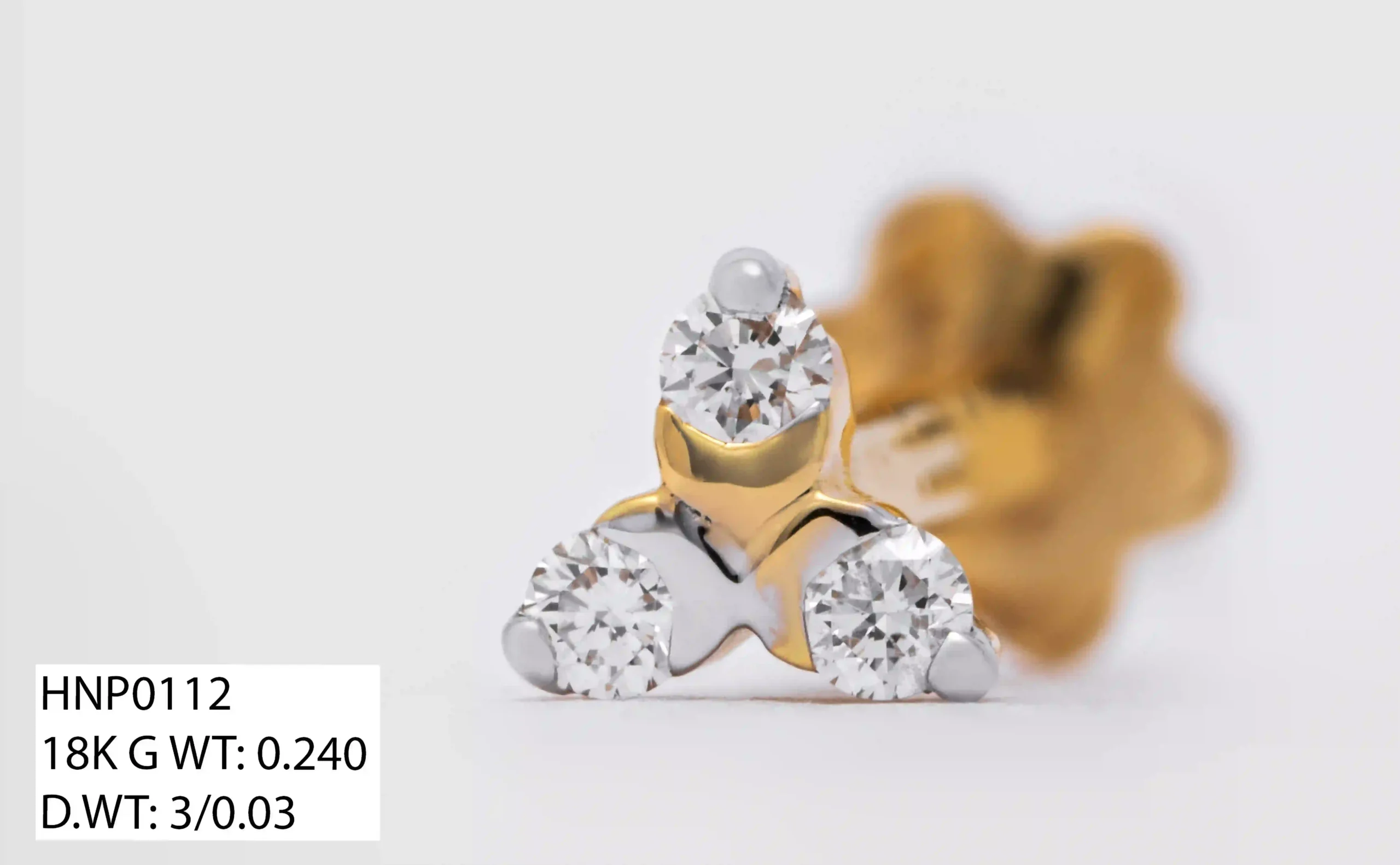 This delicate 18K gold nose pin (Model: HNP0112) features a classic three-stone design with brilliantly cut diamonds that add a subtle yet captivating sparkle. With a gold weight of 0.240g, it offers a lightweight and comfortable fit, perfect for everyday wear while maintaining a luxurious appeal. The three diamonds, totaling 3/0.03 in weight, are expertly set to enhance their shine and beautifully complement the sleek, minimalistic design. Crafted with precision and fine detailing, this nose pin ensures durability, elegance, and a polished finish. A timeless accessory, it adds a refined touch of sophistication to any jewelry collection.
