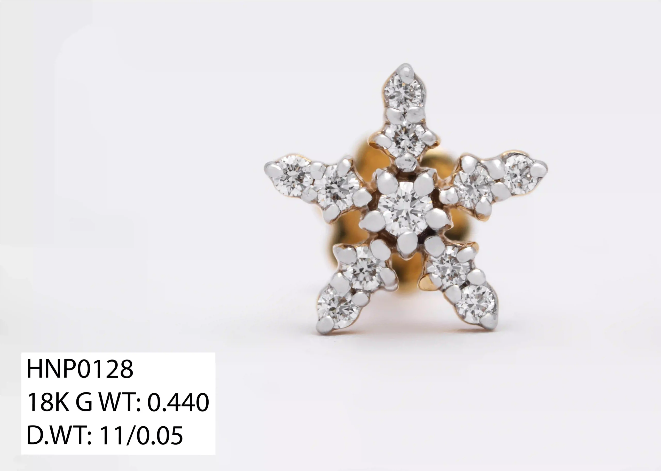 This stunning 18K gold nose pin (Model: HNP0128) features a beautifully crafted star-shaped design adorned with eleven brilliantly cut diamonds that create a dazzling, radiant sparkle. With a gold weight of 0.440g, it offers a premium, luxurious feel while remaining comfortable enough for everyday wear. The eleven diamonds, totaling 11/0.05 in weight, are meticulously set to enhance the star’s intricate form and elevate its overall brilliance. Expertly crafted with precision and finished to perfection, this nose pin delivers timeless elegance, durability, and exceptional shine. A standout accessory, it adds a touch of glamour and sophistication to any jewelry collection.