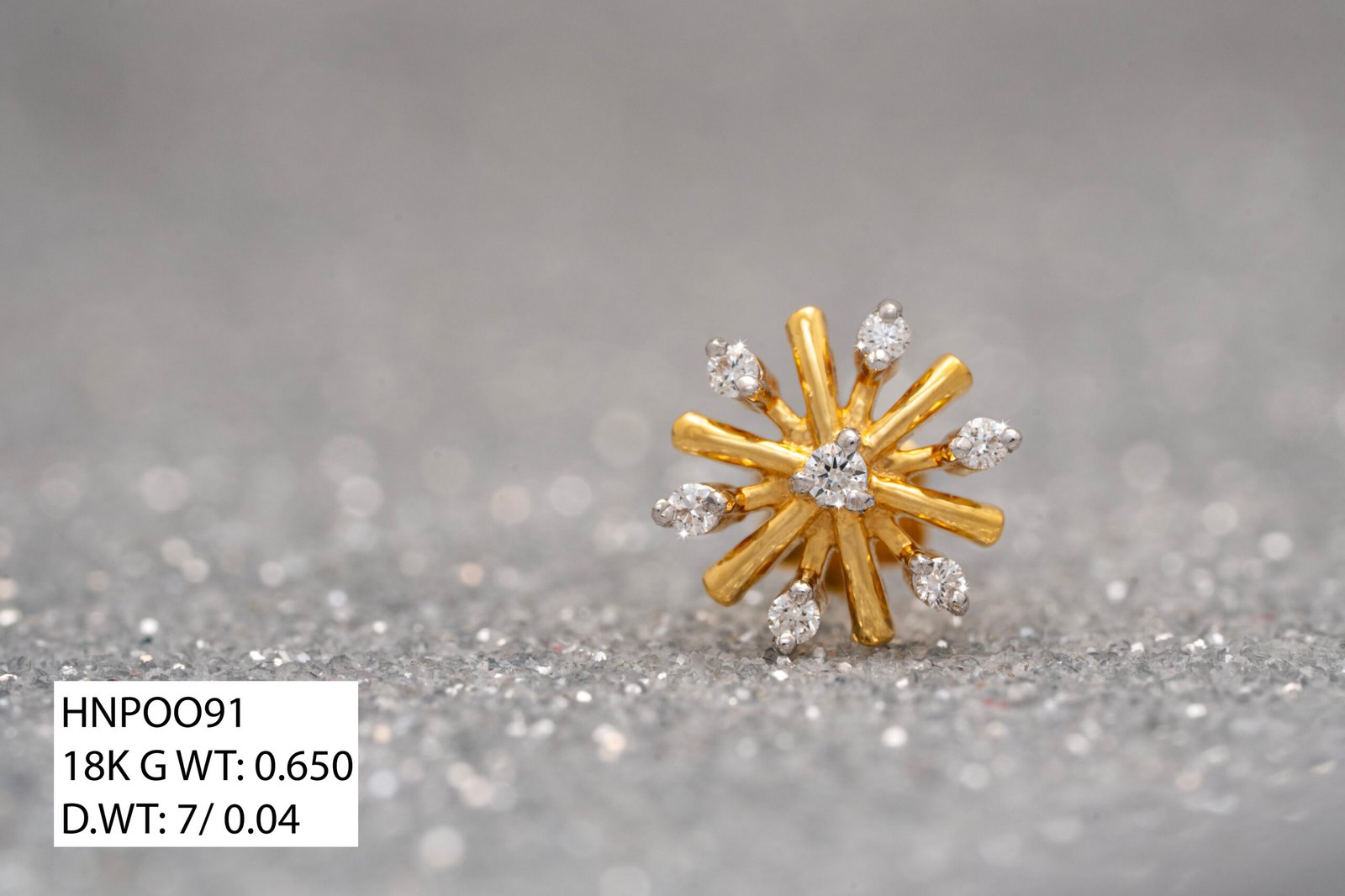 This elegant nose pin features a radiant sunburst-inspired floral design that adds a bold yet graceful sparkle. The combination of sleek spokes and shimmering accents creates a striking and unique look. Designed for a comfortable and secure fit, it sits neatly on the nose for everyday wear. Its eye-catching style makes it perfect for festive occasions as well as special events. A standout nose pin that blends elegance, brilliance, and refined craftsmanship beautifully.